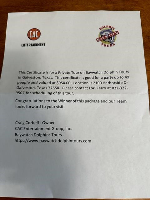 This certificate for a fun dolphin tour in Galveston Bay. Invite up to 49 of your favorite people to join you for this fun adventure.