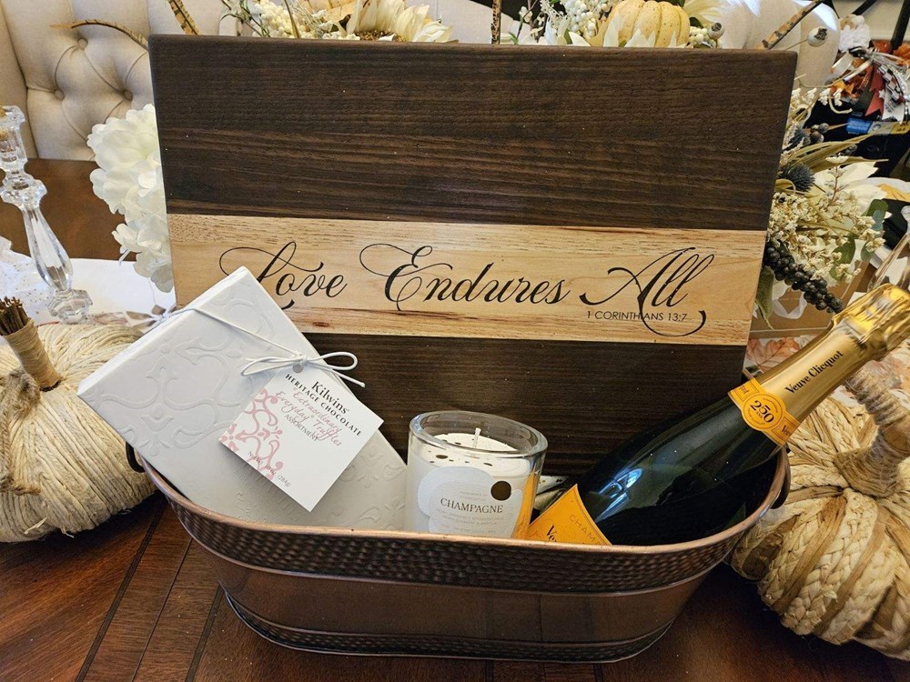 1. Love Endures All Cutting Board. 2. Kilwins truffle assortment 3. Veuve Clicquot Champagne 4. Rewined Champagne Candle 5. Bronze Beverage Tub