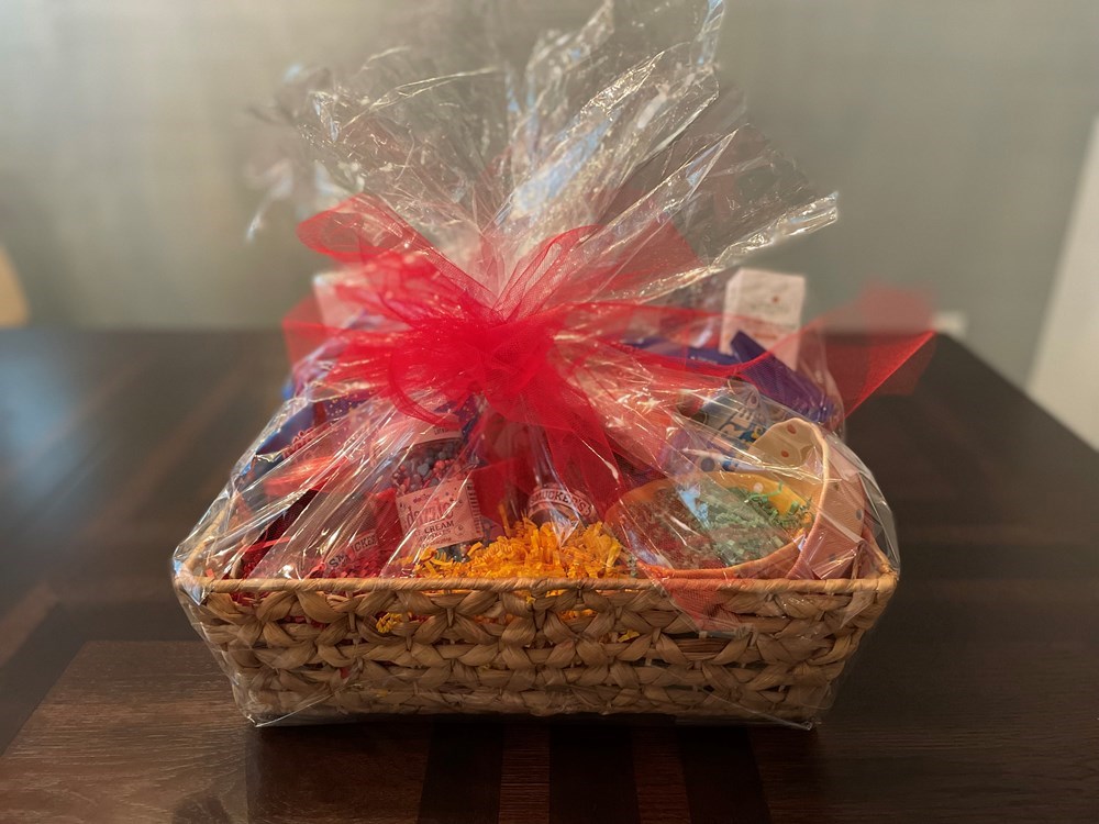 Two engraved ice cream spoons that are inscribed with “My Ice Cream Spoon” and “Your Ice Cream Spoon.” Four adorable ice cream bowls An ice cream scoop Two sleeves to keep your fingers from freezing when enjoying a pint of ice cream. Toppings (hot fudge, caramel, strawberry, and sprinkles) and cookies to create the best bowl of ice cream ever! When you want to create your own, a book full of ice cream recipes. A gift card to take the easy route and buy your ice cream at the store! Wonderful basket to use around the house after you have finished the ice cream