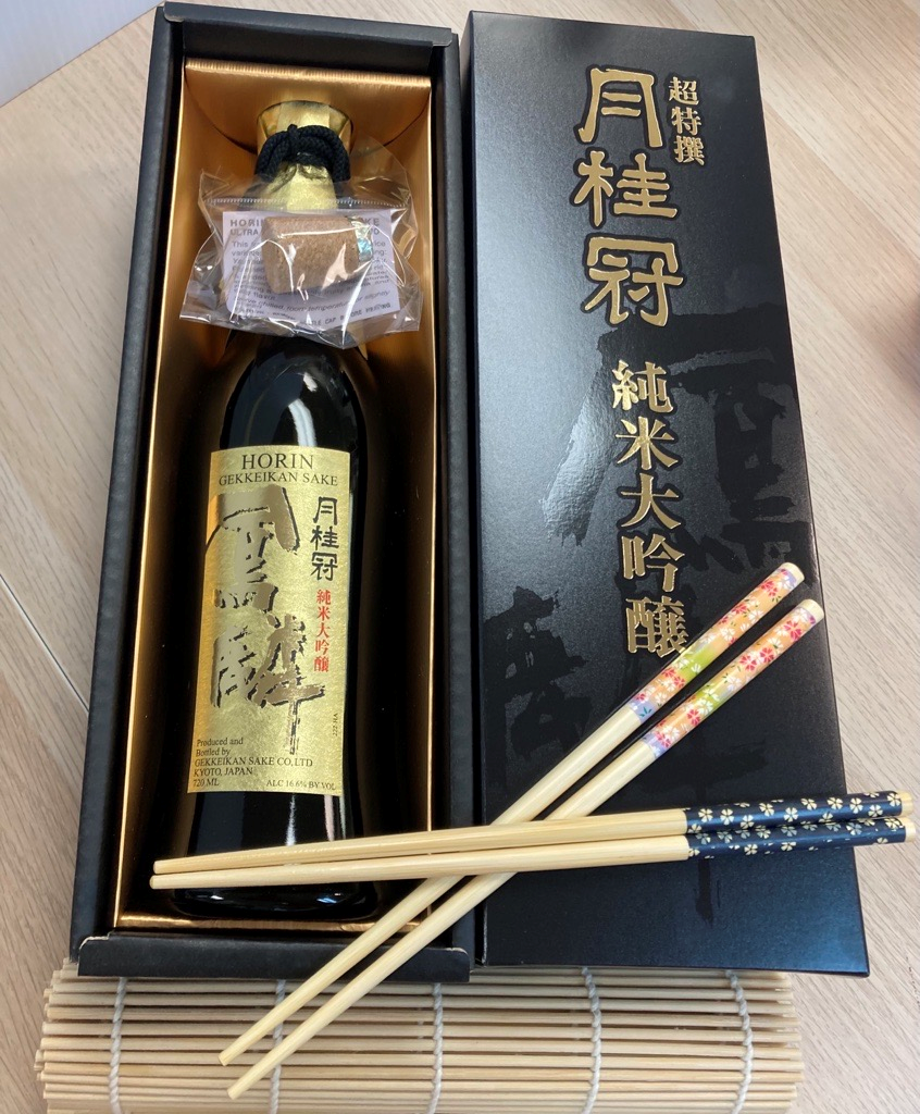 Gekkeikan Horin Sake in Keepsake Box Pink & Gray Ceramic Sake Serving Set Sushi Rolling Mat & 2 Chopstick Sets Horin’s delicate aromatics complement lightly seasoned appetizers, salads, lobster and mild fish dishes, glazed pork, fresh fruit, and lighter style fare. Horin is the flagship product of Gekkeikan and the crystallization of the skills of Fushimi-style sake master.
