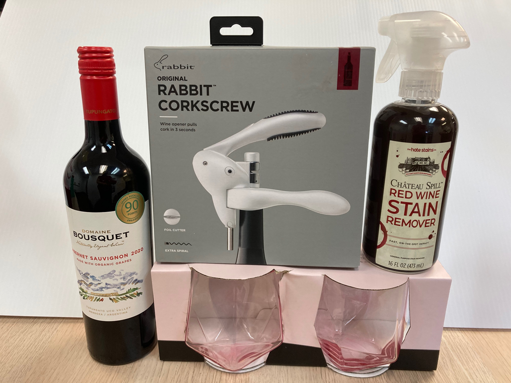 Bousquet Cabernet Sauvignon Red Wine 2 Pink Stemless Wine Glasses Rabbit Corkscrew Wine Bottle Opener Red Wine Stain Remover 2 Scented 'Mom Water' CAN-dles